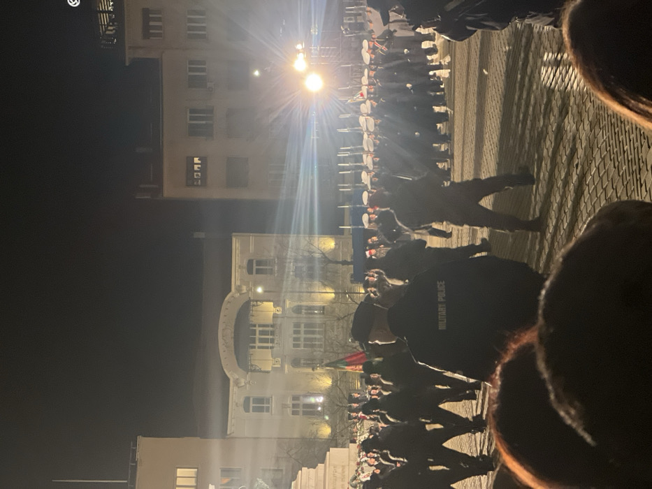 The image captures a nighttime outdoor scene in Sofia, Bulgaria, specifically in Tsar Osvoboditel Square, with the National Assembly building visible in the background. The background features the illuminated, light-colored facade of the National Assembly building, distinguished by a large arched entrance or portico on its upper level. To the building's right, a multi-story, darker-toned building with illuminated windows is present. To the left of the National Assembly building, a portion of a light-colored monument or structure is visible. In the mid-ground, a formation of approximately 25-30 uniformed individuals marches from left to right across a paved surface, likely cobblestones. These individuals wear dark uniforms with white peaked caps and carry long, slender objects resembling rifles or ceremonial pikes. At least one individual within this formation carries a flag displaying red, green, and white stripes. Prominently in the left-mid-ground, an individual is observed from behind, wearing a dark uniform jacket with the words "MILITARY POLICE" clearly visible in white text across the upper back. This individual faces away from the camera, towards the marching formation. Other indistinct figures in dark attire are present throughout the mid-ground, suggesting a gathering of people. The scene is lit by bright artificial lights, particularly from the right side, causing significant lens flare and casting long, distinct shadows of the uniformed individuals onto the ground. The sky above is dark.