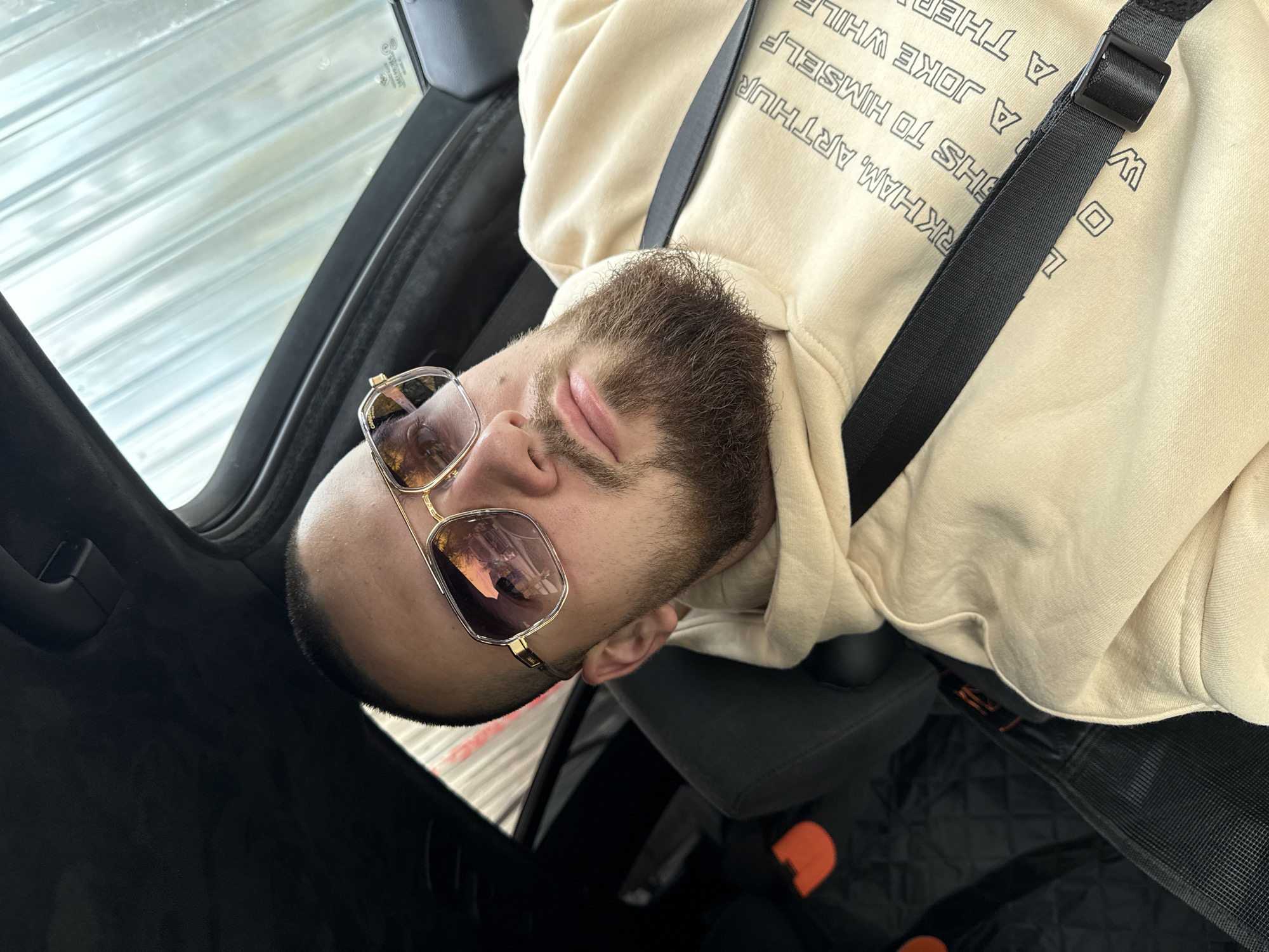 A male individual is depicted in a selfie-style photograph taken inside a vehicle in Sofia, Bulgaria. The subject has close-cropped hair and a full brown beard. He is wearing a light beige hooded sweatshirt with black text printed vertically on the front, partially visible as "RKHAM, ARTHU", "GHS TO HIMSELF", "A JOKE WHILE", "A THER". He wears rectangular, gold-framed sunglasses with tinted lenses. Reflections in the sunglasses reveal an outdoor scene with trees and sky, alongside an interior structure featuring vertical elements, possibly indicative of a car wash or covered parking facility. The man is secured by a black three-point seatbelt across his chest and left shoulder. The vehicle's interior features a dark headliner and door frame. A dark, possibly quilted, car seat is visible to the man's left, with an orange object situated on it. Through the vehicle's side window to the right of the subject, a blurred view of vertical lines and a light background is observable, reinforcing the enclosed structural environment. The window glass displays a BMW logo and other manufacturer markings. The individual maintains a neutral facial expression, looking directly towards the camera.