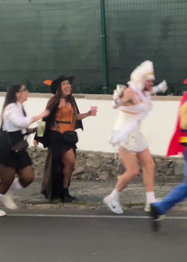 Four individuals in costumes are walking and dancing along a street. They are a schoolgirl, a witch, a person in a white dress and wig, and a superhero. The superhero is holding a cup and the rest are holding drinks. The schoolgirl pulls the person in the white dress back into the group. They appear to be enjoying themselves while walking in an outdoor setting with houses and plants visible. The music being played has a quick beat.