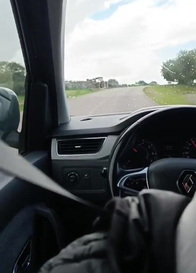 car driving on a wet road. The view is from the driver's seat, with the seatbelt visible. In the distance, a white truck is driving on the same road, approaching the car. The weather appears to be overcast with patches of blue sky.