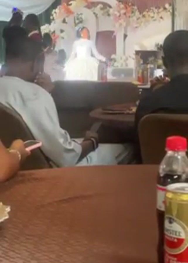 young woman in a wedding dress standing on a stage with a white archway decorated with flowers. She is surrounded by people, and there are guests seated at tables in the foreground. One guest is looking at their phone while others watch the woman on stage. A bottle of Coca-Cola and a can of Amstel Malta are on the table in front of the camera. The room is decorated for a wedding reception.