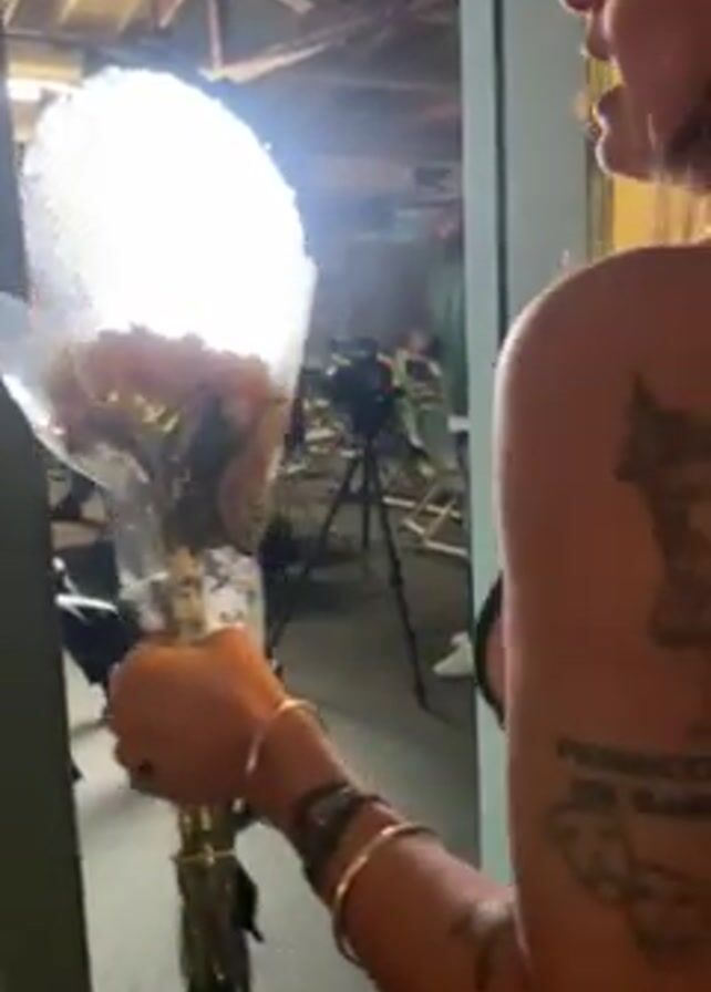 The video begins with a woman holding a bouquet of peach-colored roses as she stands in a doorway. The woman wears a green dress with thin straps, revealing tattoos on her arms and back. Through the doorway, a film set with a large light and camera equipment is visible. The woman walks into a hallway, and the camera follows. People, mostly men, are standing and talking. The scene ends with the woman talking to a man with a beard who is wearing a dark green coat and a black beanie.