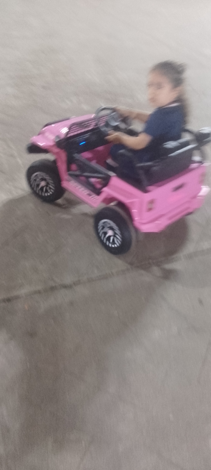A young girl with long hair drives a pink toy Jeep on a paved surface. She wears a dark blue shirt and dark pants. The Jeep has black tires with silver rims and a black seat. Motion blur suggests the Jeep is moving. The background is a plain, light-colored pavement or concrete area. The overall image has low lighting and appears to be taken with a phone.
