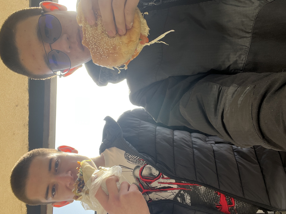 Two young males are captured in a selfie-style close-up, eating street food in an unidentified outdoor location within the city of Cherven Bryag, Bulgaria