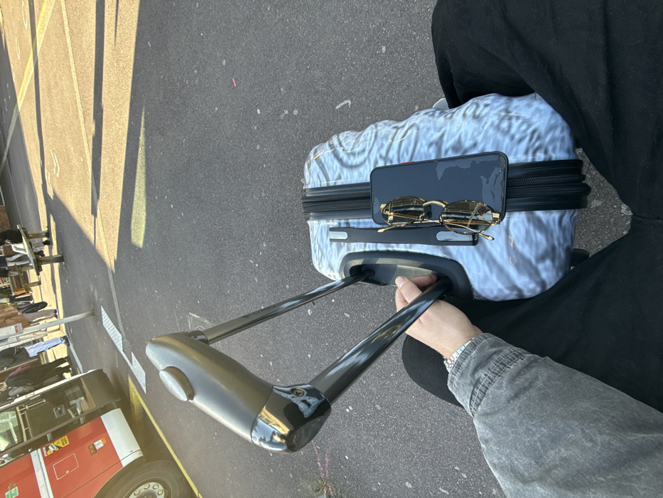 The image depicts a first-person perspective at a public transport stop in Caen, France, likely a busy interchange such as one near a university campus or the train station. The scene occurs during daytime under clear, sunny conditions, casting long shadows. In the foreground, a person's left hand, wearing a watch or bracelet and the sleeve of a grey denim-like jacket, holds the extended black handle of a light-colored, hard-shell rolling suitcase with an abstract, wavy pattern. Resting horizontally on top of the suitcase is a black smartphone, possibly an iPhone, with a red element visible on its right side. A pair of gold-framed aviator sunglasses with dark lenses is placed on top of the smartphone. The person's black-trousered legs are visible on either side of the suitcase. The midground shows a grey asphalt pavement marked with white arrows and lines. A red public transport bus, characteristic of Caen's Twisto network, is parked on the left with its front door open. Several individuals, approximately five to seven, are visible near the bus and further back on the pavement, appearing to be passengers waiting or boarding. To the right, a wooden slatted bench with dark supports is present, with one person seated on it. A light pole or signpost stands upright. The background reveals a multi-story building with reddish-brown brickwork and rectangular windows, suggesting an institutional or commercial structure. Additional indistinct figures are visible in the distance, indicating an active urban environment.