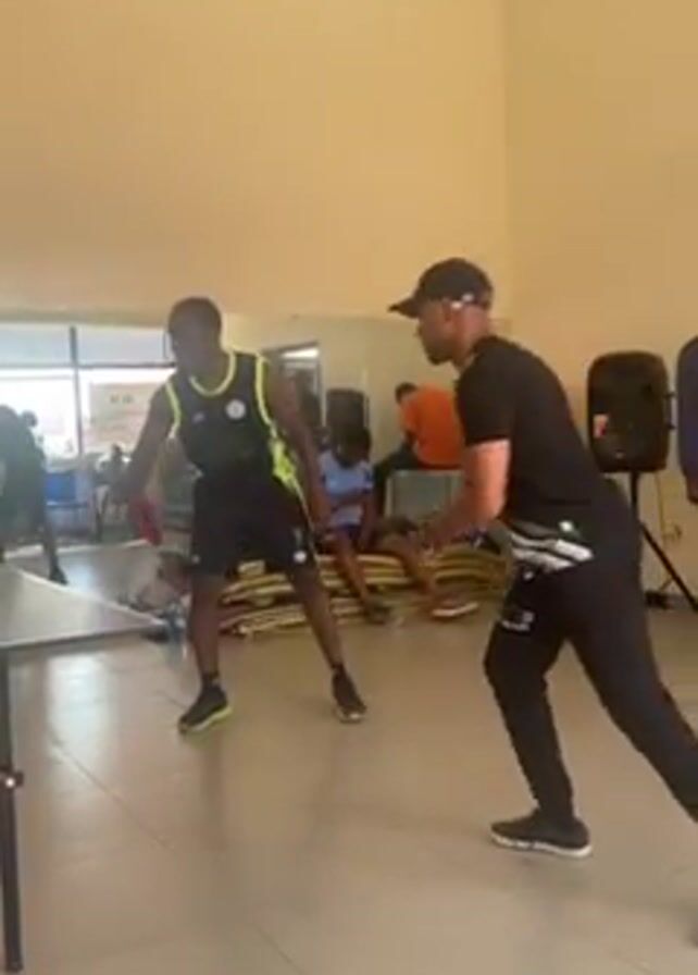 two men playing table tennis in a large, well-lit room with a beige tiled floor and light yellow walls. One man is wearing a black and lime green athletic outfit with matching sneakers, while the other is in black sweatpants and a black shirt, with a black and white striped vest, a baseball cap, and gray sneakers. A table tennis table is prominently positioned in the foreground. In the background, several people are sitting or standing near a window, some using their phones. Luggage items, like backpacks, are also visible in this area. A speaker on a stand is placed near the window. The men are actively engaged in playing table tennis, hitting the ball back and forth. They move around the table, reacting to each other's shots.