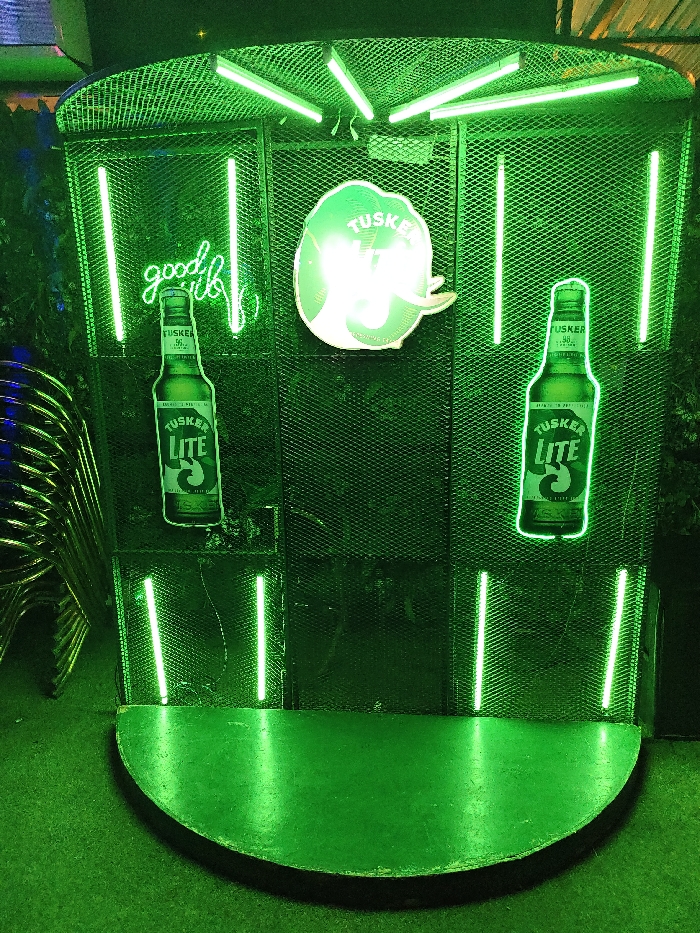 The image displays an illuminated promotional stand for Tusker Lite beer, located in Eldoret, Kenya