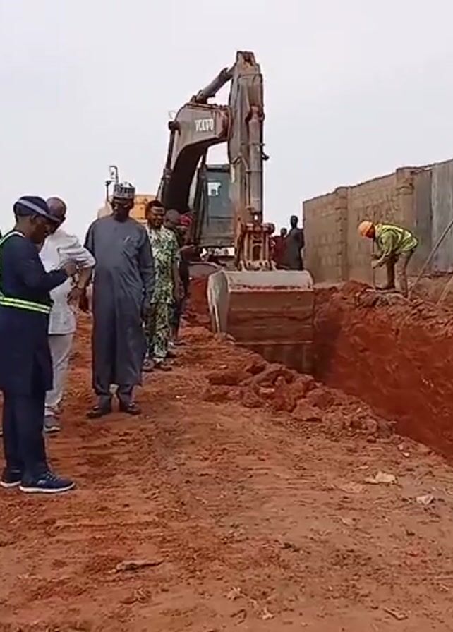 A group of people are standing near a trench being dug by a large excavator. Some of the people are wearing business attire, while others are wearing hard hats and safety vests. There is a brick wall on one side of the trench and a dump truck in the background. The ground is reddish-brown. Several workers are inside the trench, seemingly working on something.