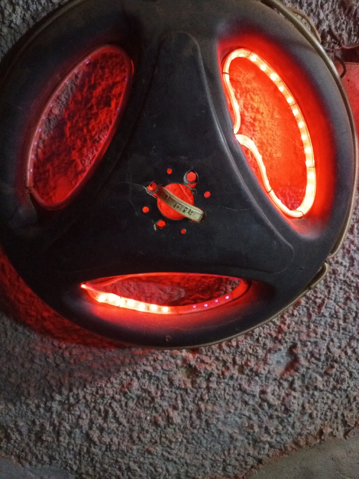 A dark, circular, possibly plastic object is mounted on a textured surface. The object has three openings filled with an orange-red glow, achieved with what appear to be LED strips. The central part of the object has a round opening with a slider or knob next to it, also lit with the orange-red color. The overall impression is that of a stylized, glowing face. The object is slightly worn, showing some scratches and wear around the control.