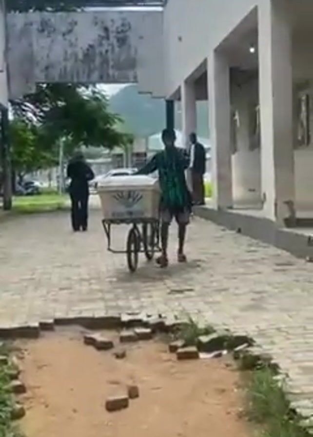 A young man pushes a two-wheeled cart down a breezeway. The cart is topped with a white container labeled "Far Milk." The breezeway has a cracked tile floor and is surrounded by white columns and partial walls. A woman in black walks in the background. The young man turns to face the camera and smiles. Trees and a mountain are visible in the background.