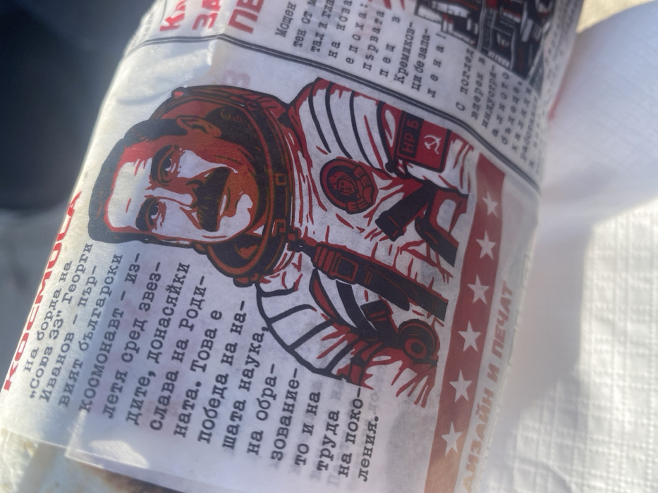 A food item, likely a wrap or döner kebab, is depicted outdoors in Vidin, Bulgaria, held in bright sunlight. The item is wrapped in white paper featuring a stylized, retro-propaganda design in red and black ink. The central image is an illustration of a man with a prominent mustache, wearing an astronaut spacesuit. A patch on his right arm displays the Cyrillic letters "НРБ" (NRB) and the hammer and sickle symbol. Surrounding text, in Bulgarian, details information about "Союз 33" (Soyuz 33) and refers to the first Bulgarian cosmonaut, Georgi Ivanov, emphasizing glory to the homeland, a victory for science, education, and labor for generations. A red border with white stars runs along the bottom of the paper, above which the text "ДИЗАЙН И ПЕЧАТ" (DESIGN AND PRINT) is visible. The wrapped item rests partially on a white, textured surface, possibly a napkin.