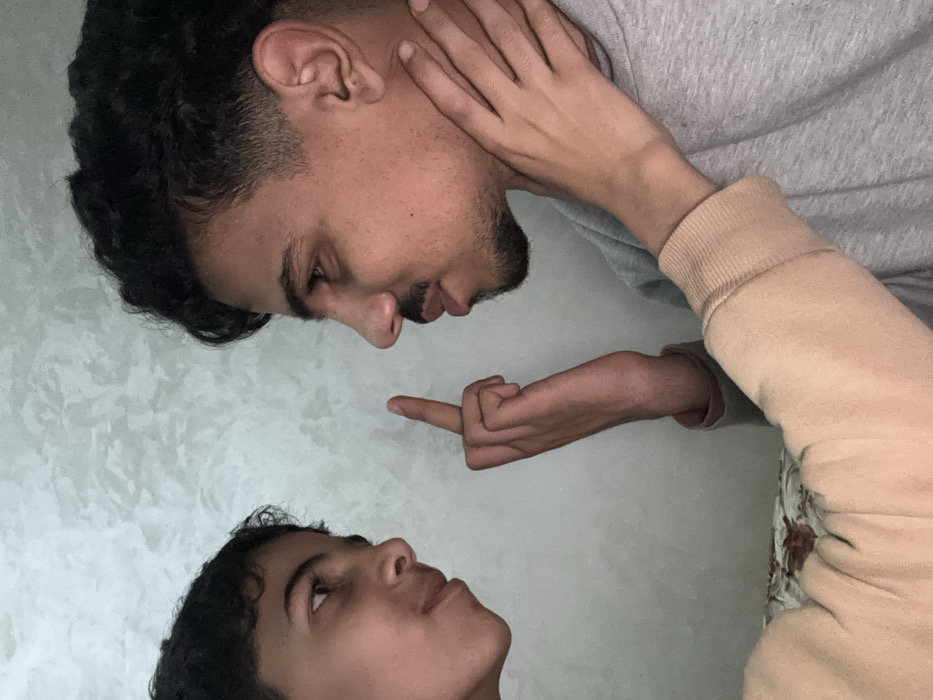 Two individuals are visible. One, with curly hair and a beard, is positioned above and faces down. The other, also with curly hair, is below, looking up. An arm with a hand extended in the middle finger gesture is between them. The upper individual wears a gray sweater, while the lower one is in a beige sweatshirt. The background is a textured, light-colored wall.