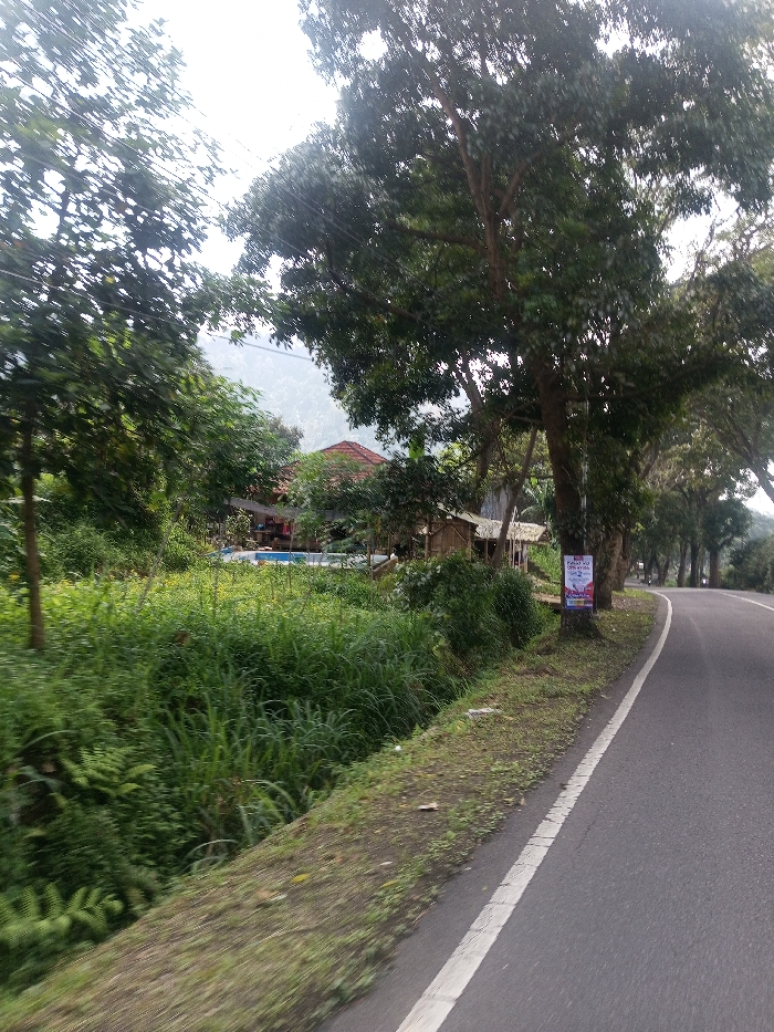 The image depicts a rural roadside scene in Chhenangri_Rishor, Bhutan, under diffused daylight. A paved asphalt road occupies the right side, curving slightly to the right in the distance, marked by a solid white edge line. Adjacent to the road is a narrow, grassy shoulder, giving way to a dense expanse of unkempt green vegetation, including tall grasses and ferns, filling the left foreground and midground. Set back from this vegetation on the left, a property features a building with a reddish-brown tiled roof. A rectangular blue swimming pool is visible in front of this building. To its right, several smaller, rustic structures with simple roofs are partially obscured by foliage. Numerous large trees with dense green canopies line the road on the right, one bearing a colorful promotional banner affixed to its trunk. Further trees and dense greenery extend across the left side of the frame. Hazy green hills or mountains form the distant background beneath a bright, overcast sky. No individuals or active movements are observed.