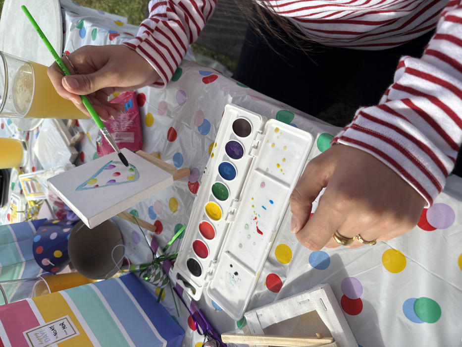An overhead view captures an outdoor art activity taking place on a table in Accord, United States. The scene is illuminated by bright sunlight. In the foreground, a person, wearing a red and white striped long-sleeved shirt and gold rings on their left hand, is actively painting a small white canvas mounted on a miniature wooden easel. The right hand holds a green-handled paintbrush, applying green paint to an outlined party hat design on the canvas, which already features multicolored polka dots. An open white plastic watercolor paint set, containing multiple colored paint pans (black, red, yellow, green, blue, purple, brown) and mixing wells with paint splatters, rests on the table. The table is covered with a clear plastic tablecloth adorned with a scattered multicolored polka-dot pattern. Nearby objects include a blue and white striped gift bag labeled "happy day! TO NOAH FROM RGR," two glasses containing an amber liquid beverage, a brown spherical object, and green tinsel. Another small, unpainted canvas on a miniature easel is visible to the left. Green grass is discernible in the soft-focus background.