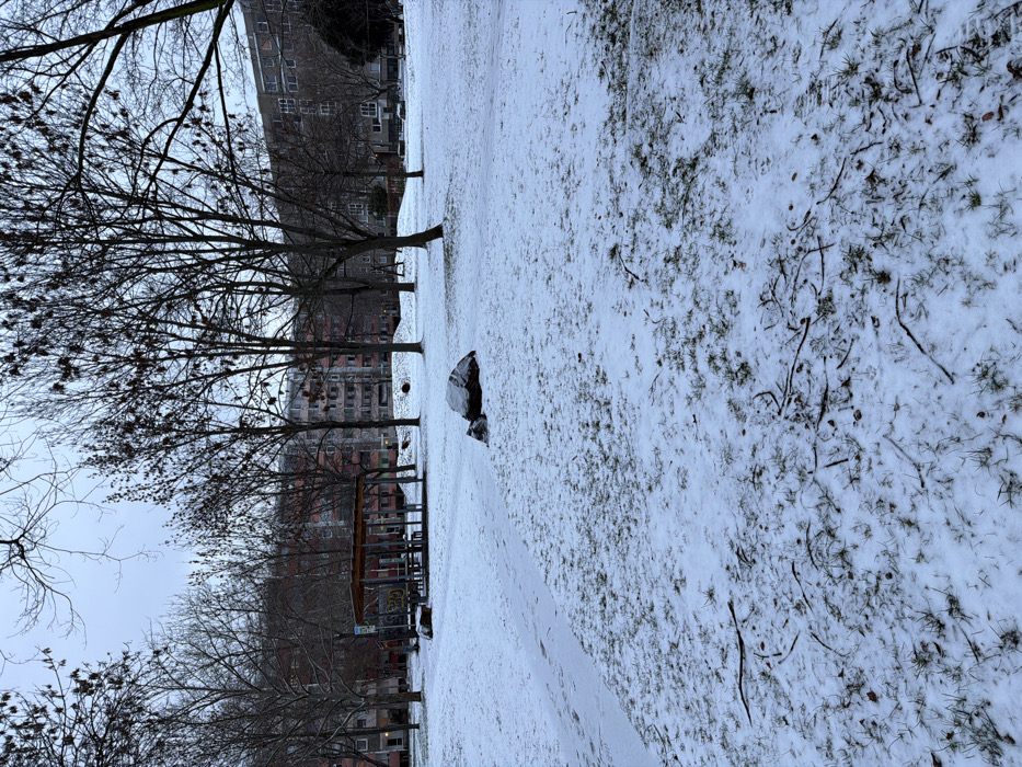 A snowy park scene features bare trees lining the left side, leading to a multi-story building in the background. A snow-covered field stretches towards the right, with some grass visible beneath the thin layer of snow. A dark object rests on the snow-covered ground in the middle. A covered structure with graffiti is also present amidst the trees. The sky is overcast.