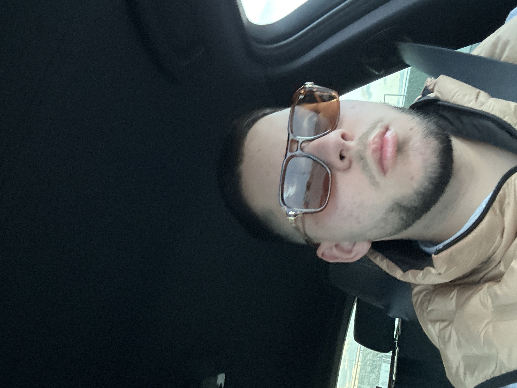 A young adult male, with a faded haircut and a short beard, is depicted in a selfie taken inside a vehicle