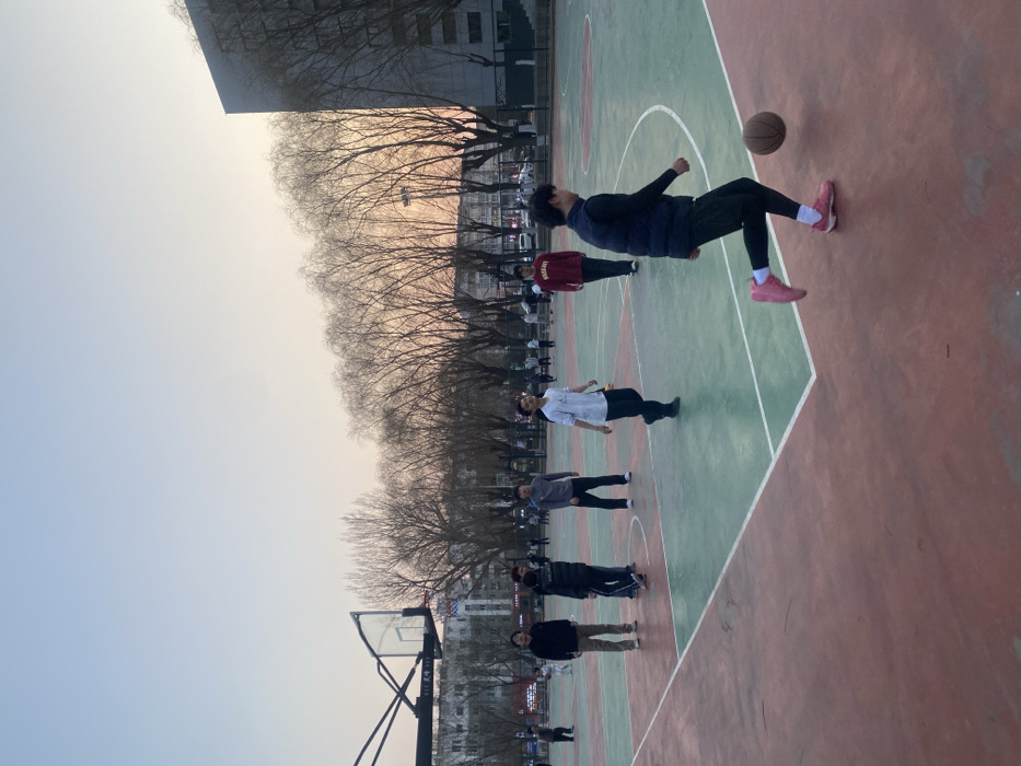 The image depicts an outdoor basketball court in the city of Zhongtun, China, during the late afternoon or early evening. The sky transitions from light blue to a pale orange-pink at the horizon, indicative of sunset. On the court, approximately ten individuals, primarily young males, are visible. In the immediate foreground, a male subject in a dark blue puffer vest, black pants, and pink athletic shoes dribbles a basketball with his right hand. The basketball is mid-bounce. Other individuals are distributed across the court: * Three males stand near the mid-court line on the left. * Another male in a grey long-sleeved shirt and black pants stands further back on the left. * Two males are positioned on the right side of the court, one in a white t-shirt and dark pants, and another in a maroon "HARVARD" sweatshirt and black pants. * Additional figures are visible in the background, further down the court. The court features distinct sections of green and red surfacing, separated by white lines, including a three-point arc. A basketball hoop with a transparent backboard and a black support structure is present on the left side of the frame. Beyond the court, a row of deciduous trees with bare branches extends across the mid-ground. Multi-story buildings, likely residential or commercial, are visible behind the trees and further in the distance. A tall, dark building with visible window structures is on the far right. Street lights are discernible among the trees. The overall environment suggests an urban or semi-urban setting.
