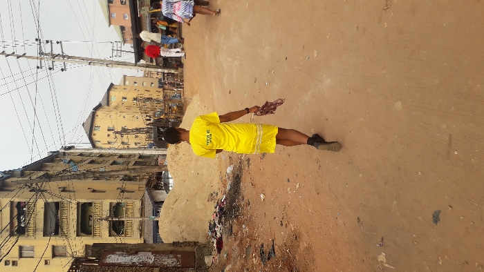 A person in a yellow outfit stands in the middle of a dirt road in a somewhat urban area. They hold a piece of cloth in their right hand. Buildings line the street, and power lines crisscross overhead. A pile of trash sits on the side of the road. Other people are visible in the distance at the top of the image. The road is light brown and dusty, and the buildings appear old and weathered.