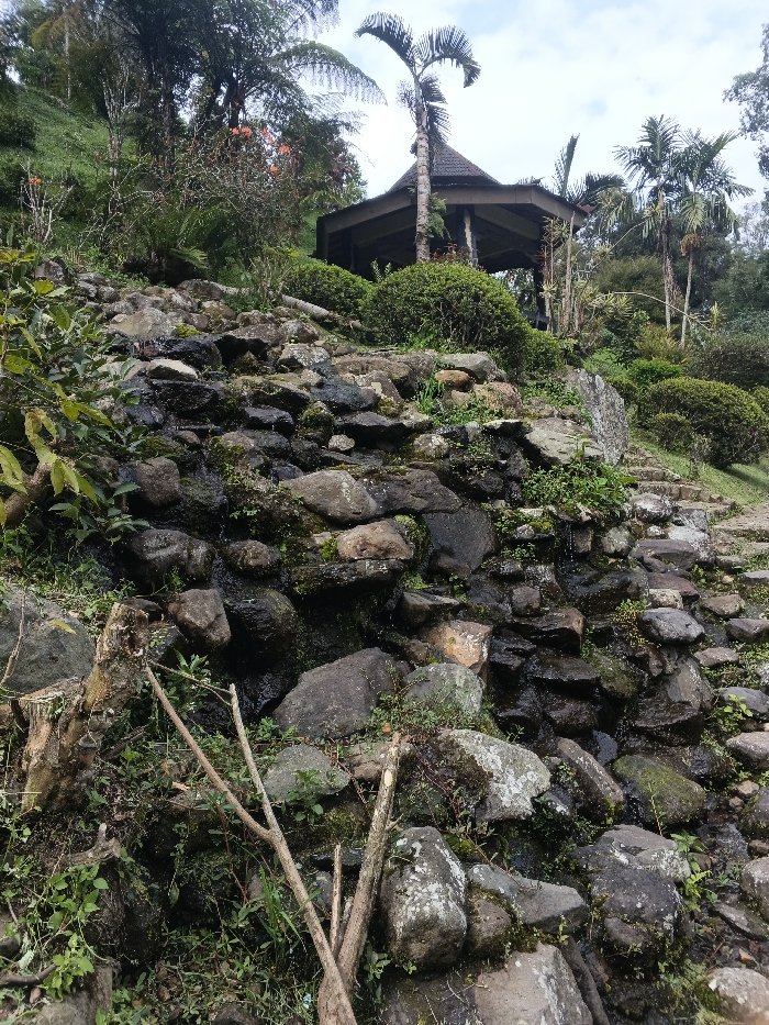 The image displays a steep, rocky, vegetated hillside located in Tamghas, Nepal. In the foreground and midground, a rocky embankment forms a small cascade with visible water flowing over moss-covered, grey and dark stones. Green foliage and small plants grow densely between and around the rocks. In the lower left foreground, several cut tree branches and a tree stump are present. A stone pathway or steps ascends the right side of the incline. At the crest of the hill, an open-sided, hexagonal or octagonal pavilion with a dark, conical roof is situated, surrounded by manicured green bushes and numerous trees, including prominent palm trees. The upper background consists of dense green tree canopy under a partly cloudy sky. No individuals or animals are visible.