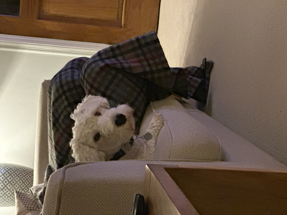 - "A fluffy white dog with a black collar is perched on a beige cushioned chair" by FM-o3SHn1, licensed under CC BY 4.0
