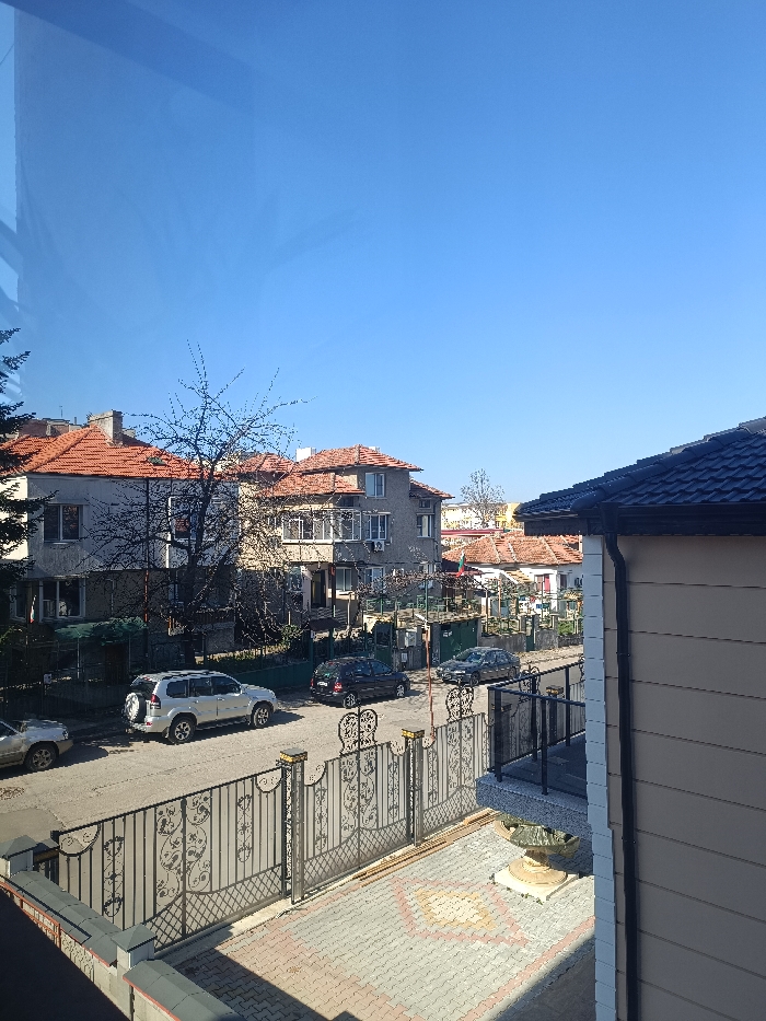 This image displays a residential street in Targovishte, Bulgaria, observed from an elevated position under a clear, bright blue sky