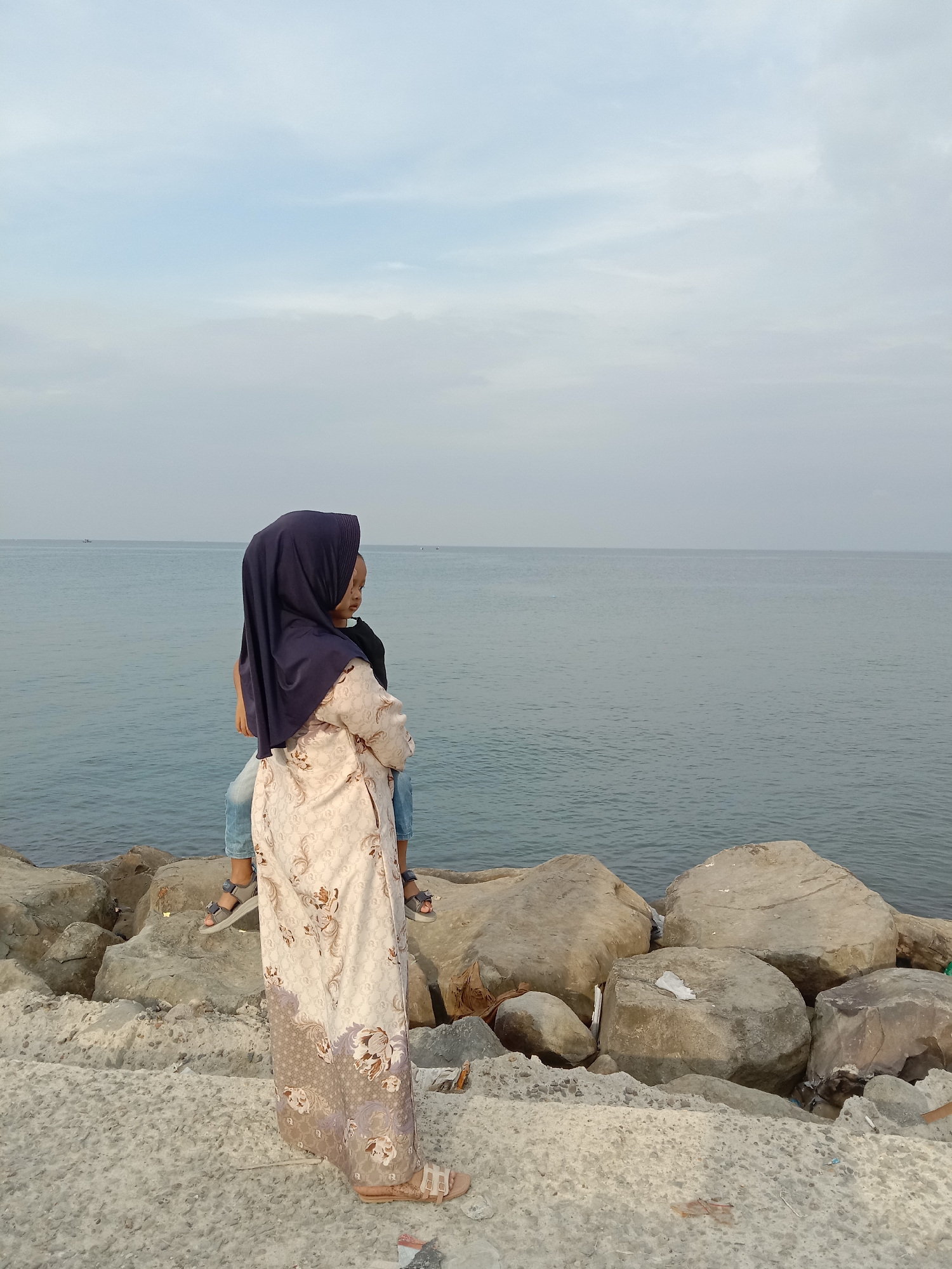 The image depicts a coastal scene in Lhokseumawe, Indonesia, featuring two individuals positioned near the water on a man-made rocky embankment. The sky is largely overcast, appearing light grey with faint lighter blue areas towards the upper portion. In the foreground, a textured, light grey concrete surface transitions to a barrier of large, irregularly shaped grey and tan rocks. A female subject, viewed from her left-rear, stands on the concrete with her arms crossed. She wears a dark blue hijab, a long-sleeved, light beige or off-white dress patterned with brown and muted purple floral designs, and light-colored open-toed sandals. Her gaze is directed towards the sea on the right side of the frame. Behind and slightly to the left of the female, a younger individual or child is partially visible, standing amongst the rocks. This individual wears a black shirt and light blue jeans, with grey open-toed sandals. Their head is partly obscured by the female's hijab, but they also appear to be looking out towards the sea. The body of water, likely the sea, is calm and appears a consistent grey-blue, extending to a clear horizon line under the sky. Two small, dark silhouettes of what appear to be boats are discernible on the distant horizon. Scattered debris, including what resembles white plastic, is visible among the rocks at the water's edge.