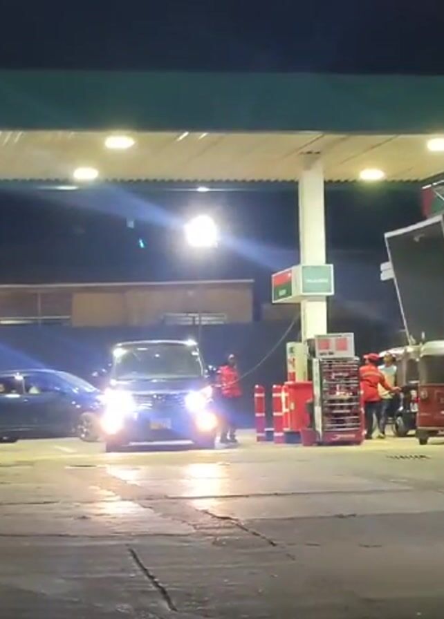 At night, a Puma gas station is brightly lit with overhead lights. The price for unleaded gasoline is 28.43 and for diesel, 28.73. Two women stand on the left side of the frame near the entrance to the gas station. A blue car is parked at one of the gas pumps. A van with its headlights on is pulling up to another pump. Several gas station employees in red shirts are standing near the pumps. A red three-wheeled taxi is parked on the right side of the frame.