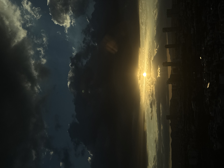 An elevated, long-range photograph captures the skyline of Puebla City, Mexico, during golden hour illumination. The sky occupies the majority of the frame, dominated by extensive, dark grey cumulus clouds, with a segment of dark blue sky visible in the upper right. The sun, a bright white-yellow orb, is positioned slightly left of center, radiating intense light and illuminating a horizontal band of golden clouds, with discernible sunbeams piercing through the lower cloud layers. Below the illuminated clouds, a distant range of dark mountains or hills is silhouetted against the horizon. The city of Puebla extends across the lower portion of the image, appearing largely in silhouette due to the backlighting. Several prominent, tall, modern buildings are visible as dark, monolithic structures in the mid-ground, rising above the dense, unlit urban sprawl which shows minimal artificial lighting. No individuals or specific activities are observable.
