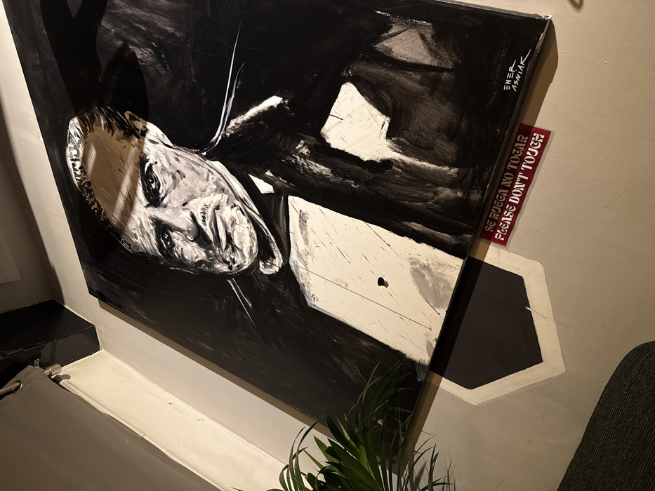 This image captures an interior scene in Palma, Spain, featuring a large, vertically oriented canvas painting mounted on a light grey, textured wall. The artwork is a black and white expressive portrait of an older male with prominent jowls and a mustache, depicted in a tuxedo with a white shirt and bow tie. A dark circular mark is visible on the white shirt area of the painting. The signature 'ENER ABNIAK' is located in the bottom right corner of the canvas. Below the painting, a red rectangular sign with white text reads 'SE RUEGA NO TOCAR' and 'PLEASE DON'T TOUCH'. A portion of a green, leafy plant is visible in the lower left, adjacent to a dark, upholstered furnishing. An angled, yellowish light reflection crosses the upper right area of the painted subject's head. Overhead, a dark structural beam is present in the top-left corner where the wall meets the ceiling.