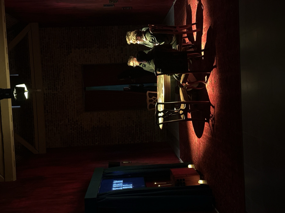 The scene depicts an interior room located in the City of Westminster, United Kingdom, characterized by a dominant dark red aesthetic. The walls are covered in textured dark red fabric, with a section of exposed red brickwork forming the rear wall. The floor is covered by a patterned dark red carpet in the illuminated area, with a darker, possibly wooden, floor in the immediate foreground. An overhead spotlight casts a bright circle of light onto a central, ornate wooden table and the surrounding area. Four individuals are seated at this table, partially illuminated. One person, wearing glasses, is positioned facing left from the viewer's perspective. To their right, another individual with lighter hair is seen in profile. A third person is seated with their back partially turned towards the viewer, wearing dark attire. A fourth individual is largely obscured. The chairs are wooden with decorative backs. On the left side of the room, a structure resembling a booth or cabinet, draped with dark green curtains, displays a brightly lit screen. The screen exhibits abstract light-colored shapes or patterns on a dark background. Below this screen, on a small wooden stand, two lit white taper candles provide additional soft illumination. Two further lit white votive candles are placed on the carpet directly below. In the background, a dark arched doorway reveals a glimpse of a solitary figure standing in silhouette, partially obscured by darkness and a sliver of distant light. The overall lighting is dramatic and low-key, emphasizing the central gathering.