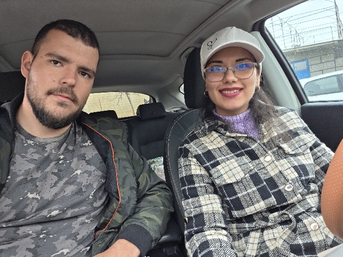 Two individuals are seated inside a vehicle located in Staroseltsi, Bulgaria. A male with short dark hair and a beard occupies the left side, wearing a grey camouflage t-shirt and a dark green camouflage jacket with orange trim. He looks forward with a neutral expression. To his right, a female with dark hair wears a light-colored baseball cap featuring a dark emblem, eyeglasses with clear frames and blue-tinted lenses, a purple knit top, and a black and white plaid jacket. She smiles directly at the camera, exhibiting pink lipstick. The vehicle's interior features black seating and a visible sunroof. Through the passenger side window, an overcast sky, an industrial-style building with a blue door, a white vehicle, and a fence topped with barbed wire are observable in the background.