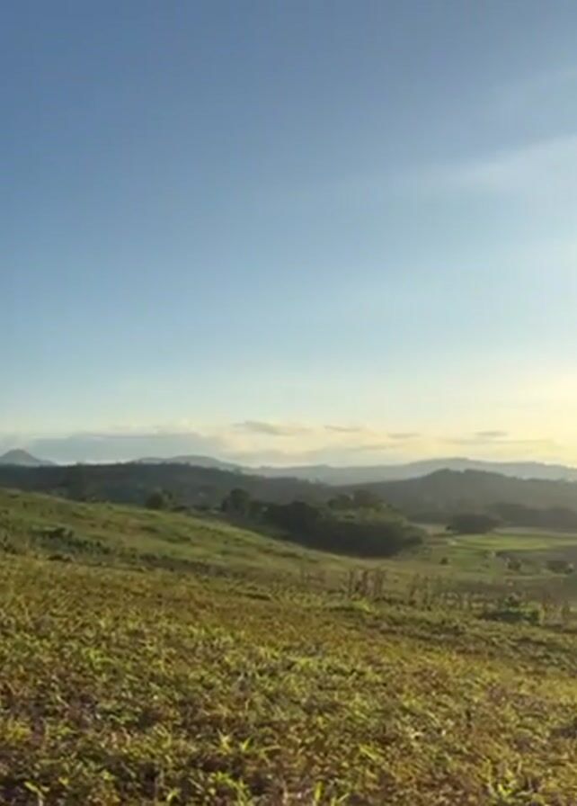 The video pans from a grassy hillside, across a valley with trees and fields, to a mountain range with the sun rising over it. A small body of water can be seen in the valley. Someone says "Meow" towards the end of the video.