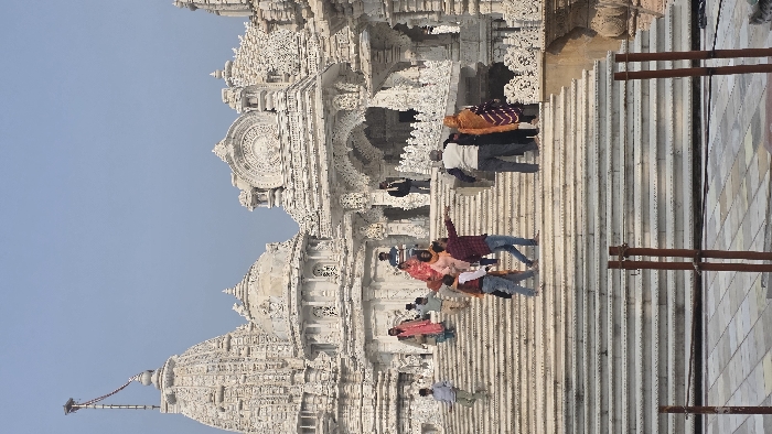 A large, ornate white temple dominates the scene, set against a clear blue sky. People are ascending the steps, some pausing to pose for photos. The temple features intricate carvings and domes. Brown poles are visible on the right.