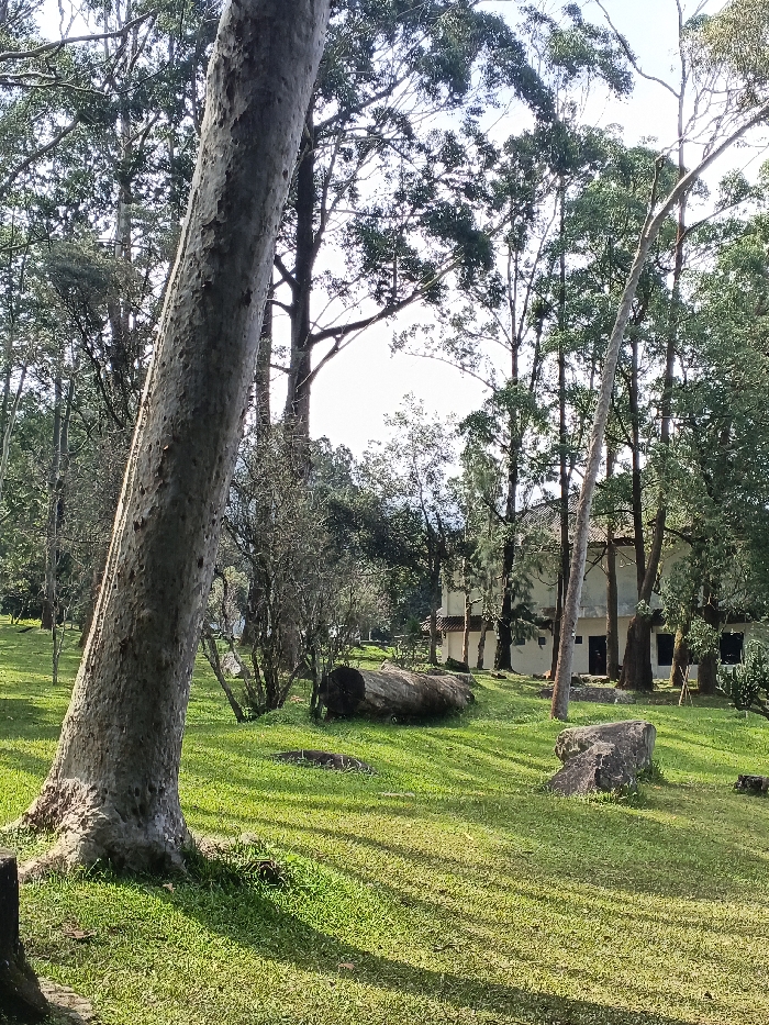 A grassy clearing under a canopy of tall trees, dappled with sunlight, leads to a pale building in the background. A massive, light-colored tree trunk dominates the left foreground. Scattered logs and rocks add texture to the lawn. The trees' thin, upright trunks contribute to the overall sense of height and serenity. The house is two-storied, with dark windows and doors.