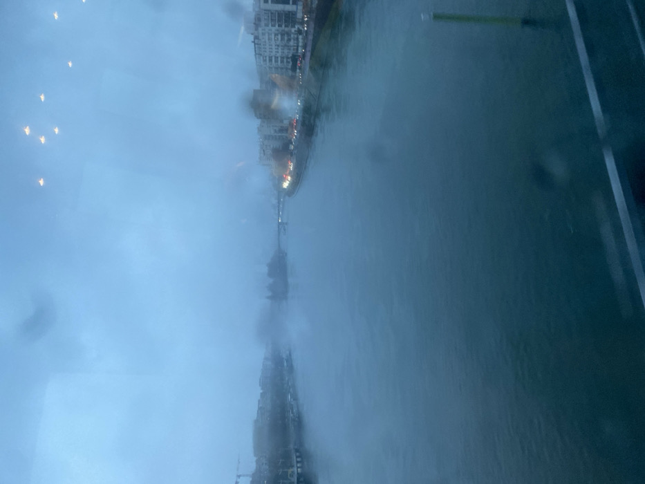 A blurry, rainy window view showcases a cityscape along a body of water. Tall buildings line the distant shore, partially obscured by fog. Traffic moves along the waterfront. Droplets distort the scene on the glass. The sky is overcast and dark. A linear structure is visible in the foreground, possibly part of the window frame.