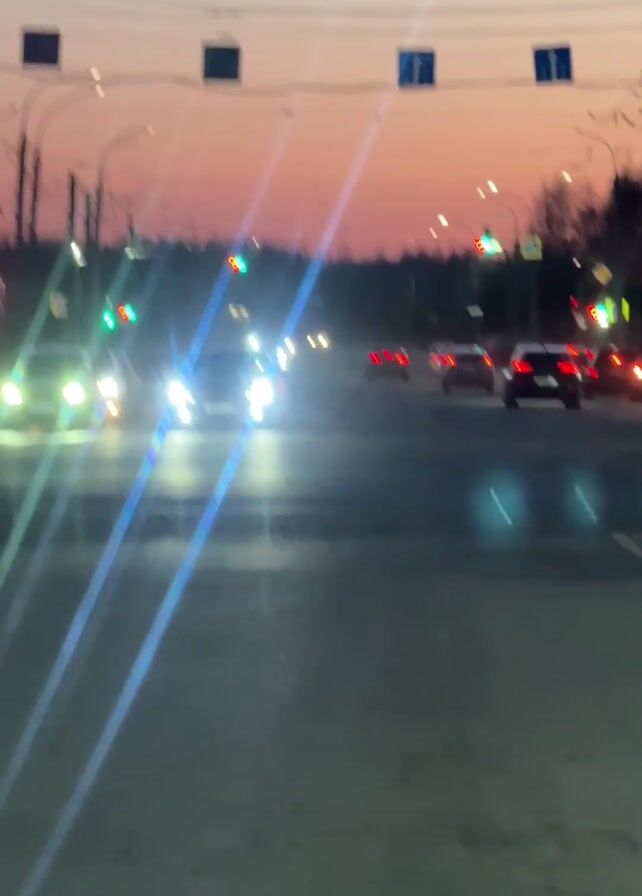 street scene at dusk with cars driving on the road. The sky is a mix of light orange and gray. Traffic lights are visible with a green light showing. There are streetlights illuminating the road. Several cars with headlights on are approaching, and some cars with tail lights are driving away. Directional road signs are above the street. A gas station sign is visible in the background. The camera seems to be handheld and slightly blurry.