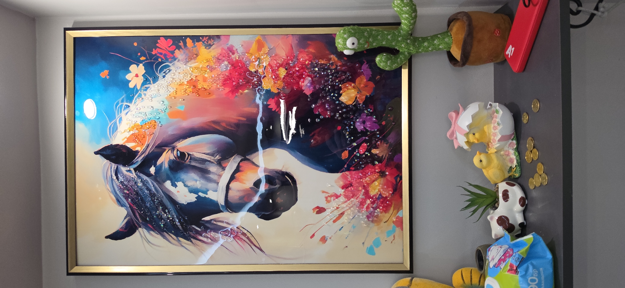 The scene is an interior space located in Kazanlak, Bulgaria. A large, vertically oriented framed artwork dominates the upper half of the image, hanging on a plain light grey wall. The artwork depicts the head and upper neck of a horse, rendered in a vibrant, expressive style. The horse is predominantly dark blue and black, featuring a white blaze on its forehead and white markings on its muzzle. Its flowing mane and parts of its body are adorned with glitter, textured embellishments resembling water droplets or pearls, and colorful abstract elements in hues of red, orange, pink, blue, and purple, suggestive of flowers and foliage. The background transitions from a light beige on the left to a dark blue on the right. The artwork is enclosed in a gold frame with a thin black inner border. Reflections, including a prominent horizontal white light streak, are visible across the artwork's surface. Below the artwork, a dark grey shelf spans the width of the frame, holding several decorative and functional objects. From left to right: * A partially visible yellow and black striped soft object. * A dark, cylindrical object. * A blue and white package labeled "90 бр" (90 pcs) in Cyrillic, featuring cartoon characters. * A white ceramic planter shaped like a cow with brown spots, containing a small green artificial succulent plant. * A cluster of small, shiny gold-colored coins scattered on the shelf. * A decorative Easter-themed figurine consisting of a white cracked eggshell with a pink ribbon bow on top, housing two yellow chick figurines amidst painted pink and green flowers. * A green plush toy resembling a cactus, with white eyes and a red embroidered mouth, positioned in a brown plush pot. * A partially visible red rectangular object with white text/design on its surface, placed in front of the cactus toy.
