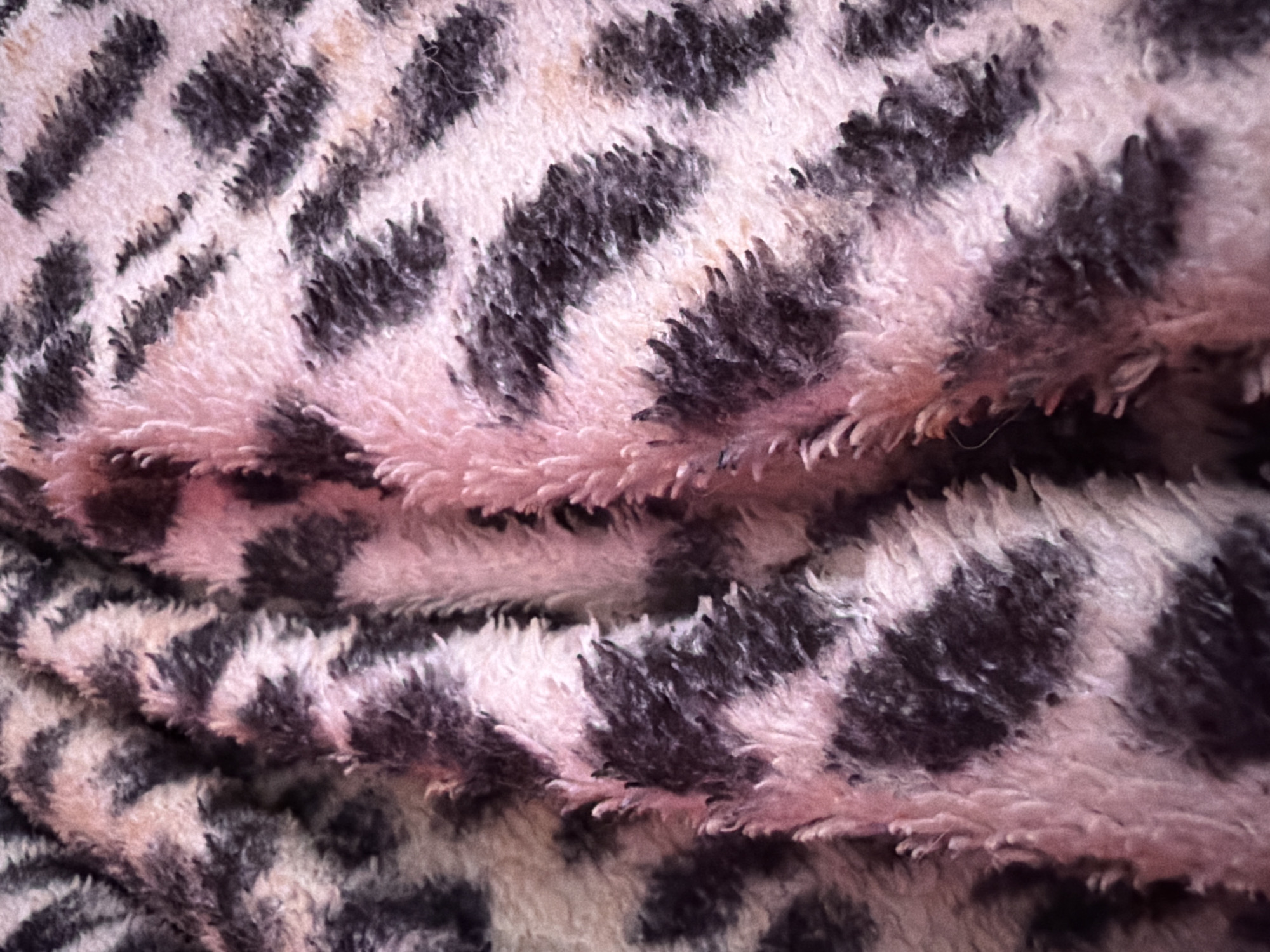 The image presents a detailed close-up of a folded, plush textile. The fabric features an animal print pattern, characterized by irregular dark grey to black markings resembling spots or stripes, set against a background of light pink and off-white/cream hues. The material exhibits a distinct shaggy and fuzzy texture, with individual fibers clearly visible, contributing to a soft and tactile appearance. Multiple prominent folds and creases are present across the fabric's surface, creating undulating contours and varying depths of shadow and light. No people, specific objects beyond the fabric, or discernible actions or interactions are visible. The location is Harmanli, Bulgaria.