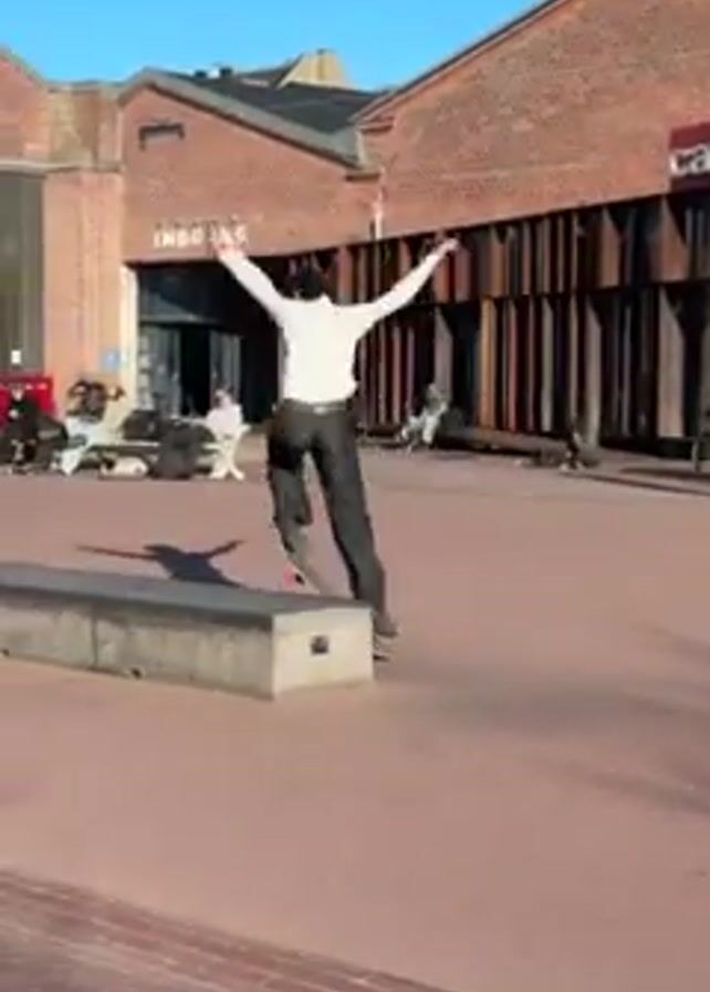 - "A skateboarder wearing a white shirt and black pants approaches a low concrete platform on a red brick plaza and successfully performs a skateboarding trick on the platform" by FM-5DZjh1, licensed under CC BY 4.0