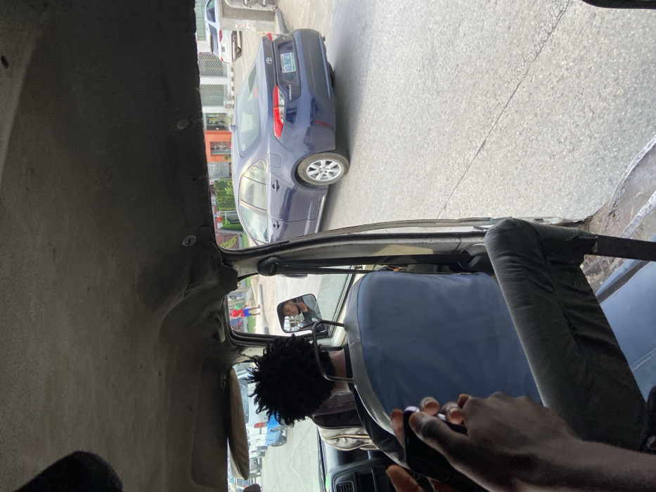 The scene is viewed from inside a vehicle, looking forward and slightly right through the front passenger window. The vehicle's interior features a worn, light grey fabric roof lining and a visible metal frame showing signs of rust. In the immediate foreground, dark-skinned hands hold a black smartphone. Ahead, the back of a person's head with dark, curly hair is visible, seated in a light blue fabric-covered passenger seat. A brown and black bag rests on the seat behind them. A side mirror, mounted inside the vehicle, reflects the face of a bearded man wearing a dark shirt. Outside the vehicle, on a paved asphalt road in Lekki, Nigeria, a dark blue Toyota Corolla sedan (license plate AGL-842JN) is prominently featured, positioned to the right of the vantage point. Further down the road, a white SUV is visible. To the left, a white van with a blue stripe and other vehicles are parked or in traffic. A male individual, wearing a red t-shirt and blue shorts, stands on the pavement to the left, facing away from the camera. The background includes green foliage and various buildings, one with an orange facade, under what appears to be an overcast sky or diffused lighting conditions.