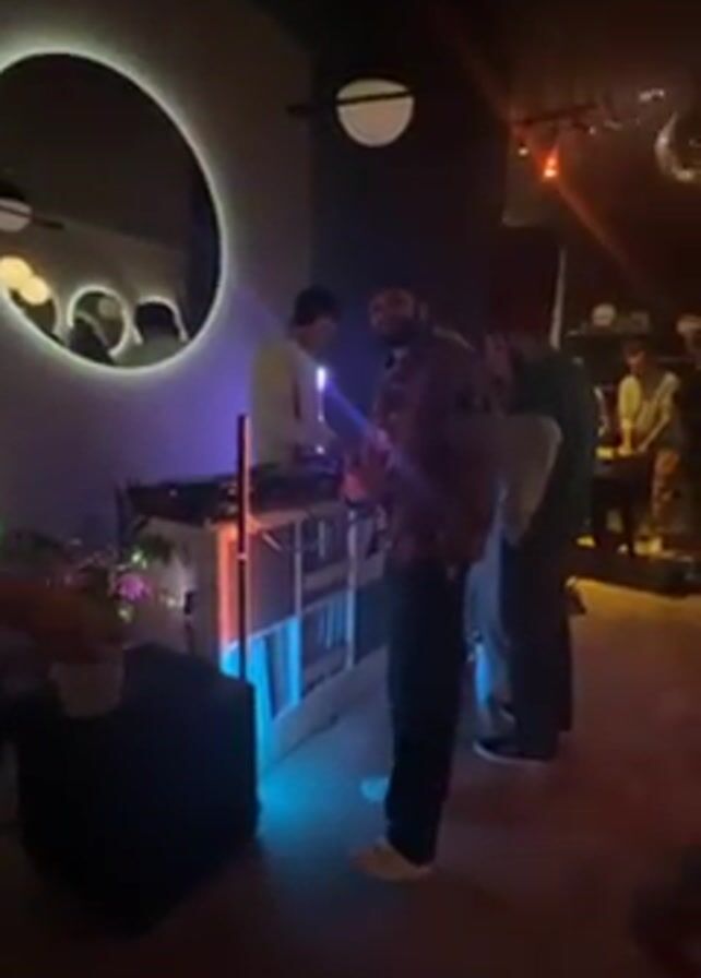 interior of a dark bar or club with several people present. A DJ is visible behind a set of equipment with blue lighting, and several people are standing around, some dancing. One man in the foreground gives a thumbs-up to the camera. There's a large round mirror on the wall and a disco ball on the ceiling. The lighting is dim and atmospheric, with various colored lights adding to the ambiance.