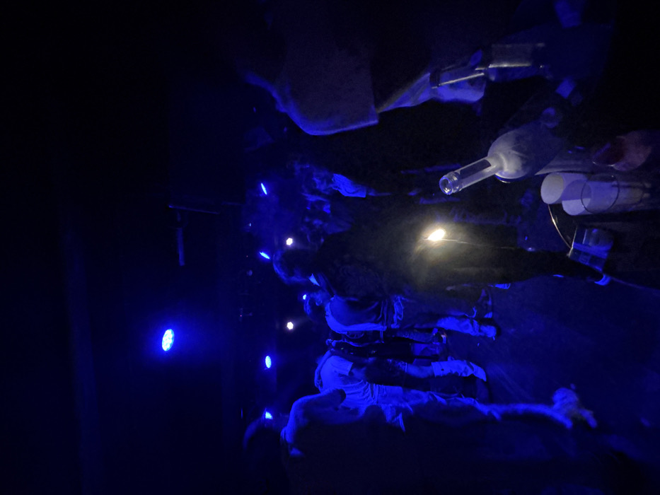 A dimly lit, rotated view showcases people standing beneath a wine bottle and several glasses suspended in the air. Blue spotlights cast an eerie glow on the scene. The background is dark, obscuring details, but hinting at a performance or installation setting. The orientation gives the impression that the figures are almost floating.