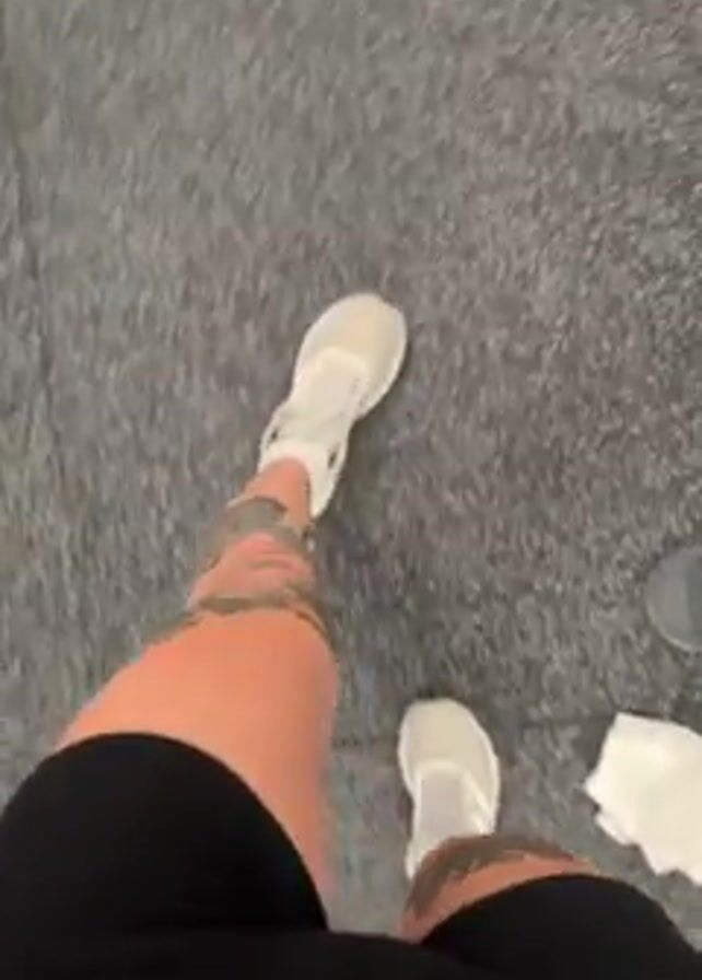 A first-person point-of-view video shows a person walking toward a squat rack in a gym. The person is wearing a black top, black shorts, and white athletic shoes, and has tattoos on their thighs. The gym is well-lit and has various weightlifting machines. When the person reaches the squat rack, the camera turns to face a mirror, revealing that the person is female. She holds her phone in front of her face and records a short video of herself in the mirror with the squat rack behind her.