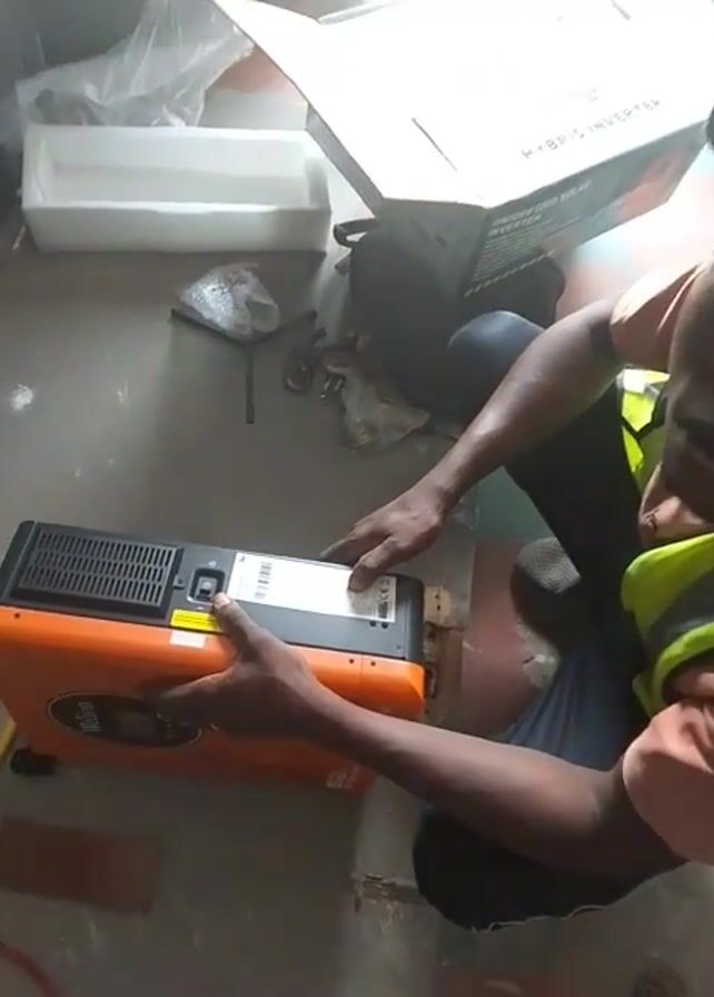 - ". The video shows a man kneeling on the floor, looking at an orange and black "Wellon" hybrid solar inverter. He is wearing a cap, a bright yellow safety vest, and dark pants. He is pointing to a label on the back of the inverter, which is on a gray floor, with the inverter box and packing material nearby. Yellow pliers and a red power cable are also in view. The room has gray walls and good lighting." by FM-JkNoI2, licensed under CC BY 4.0