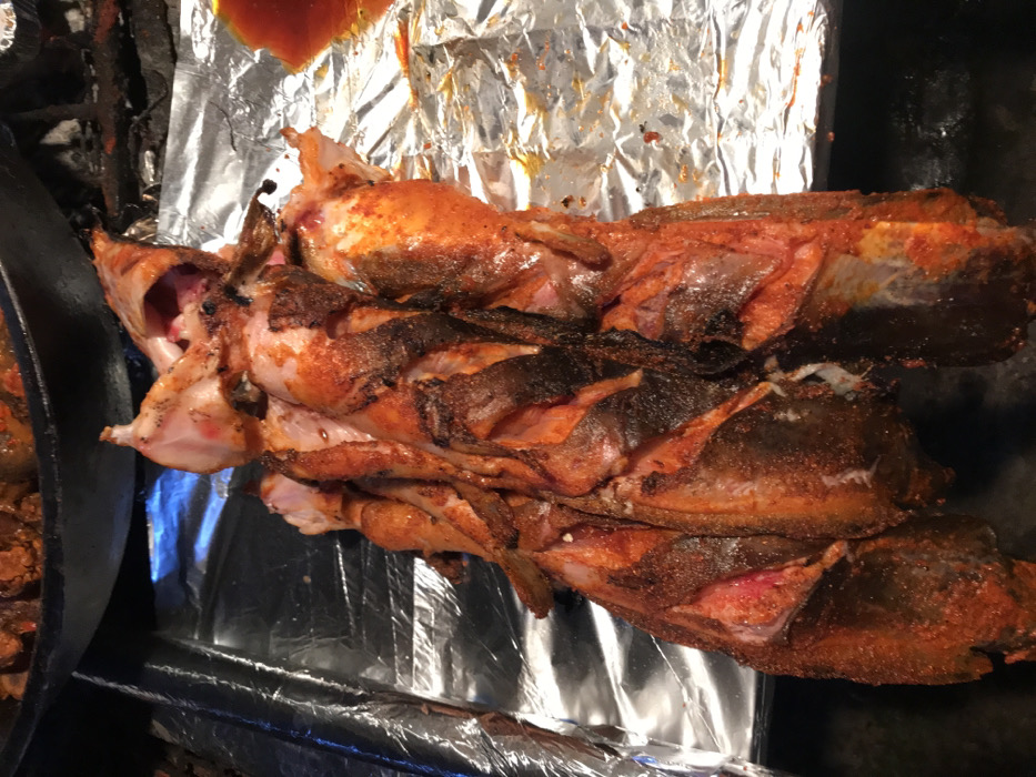 - "The image displays a close-up of several whole, grilled fish, likely catfish, arranged horizontally on a crinkled aluminum foil-lined metal tray" by FM-HcLdJ2, licensed under CC BY 4.0