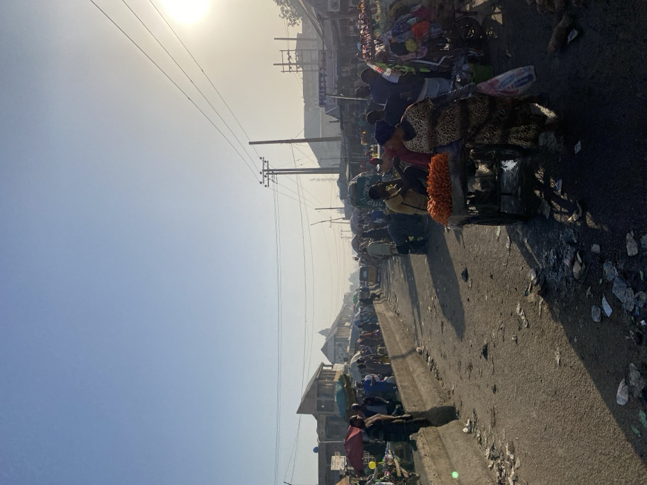 A bustling street market scene on a sunny day. People are lined up along the road, selling goods from carts and stalls. Overhead power lines cut across the sky. The road itself shows signs of wear, with debris scattered around. Buildings are visible in the background, suggesting an urban or semi-urban setting. The overall atmosphere conveys a sense of busy commerce and daily life.