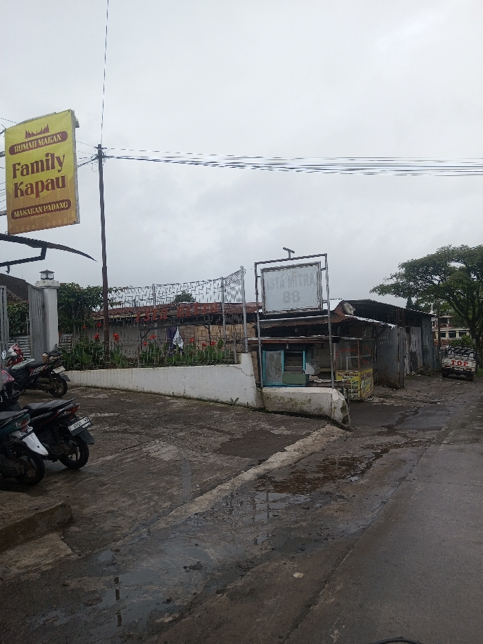 The image depicts an outdoor scene in Indonesia, likely a commercial or semi-commercial area, under an overcast sky. The foreground features a wet, uneven concrete and asphalt surface with puddles, suggesting recent rain. On the left, multiple motorcycles are parked on a concrete area. Above them, a yellow rectangular sign hangs from a utility pole, displaying "RUMAH MAKAN FAMILY Kapau MASAKAN PADANG" in brown text. Behind the motorcycles, a white concrete planter contains several red-flowering plants. A metal fence and a gated entrance are visible behind the planter, leading to an obscured property. In the center-right, a prominent white rectangular sign with a metal frame displays "ISTA MITRA 88." Beneath this sign and extending rightwards are several modest, makeshift structures constructed from various materials including corrugated metal and wood, resembling small shops or stalls. One structure displays a light blue panel or window. Further to the right, a dirt path extends behind these structures, leading towards a white pickup truck parked facing away from the viewer, with "TOP" visible on its rear. A large green tree and additional buildings are present in the background. No individuals are visible in the scene.