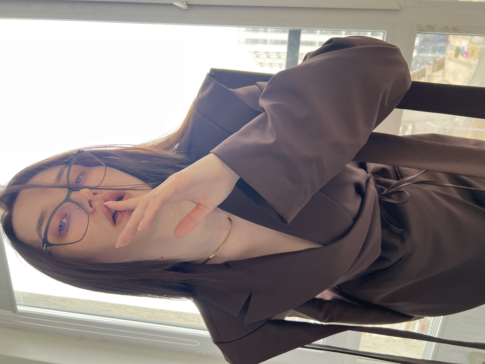 A woman with long brown hair is wearing black-rimmed eyeglasses and a brown blazer-style dress. She is touching her lips with her fingers, her fingernails painted with a light color. A thin gold necklace is visible around her neck. The background shows a blurred cityscape, suggesting an urban environment. Based on the presence of Cyrillic characters on a building visible in the background, and the request to specify the city if known, the location is possibly Tyumen, Russia, though further visual confirmation would be necessary for absolute certainty. The setting is likely indoors, near a window.