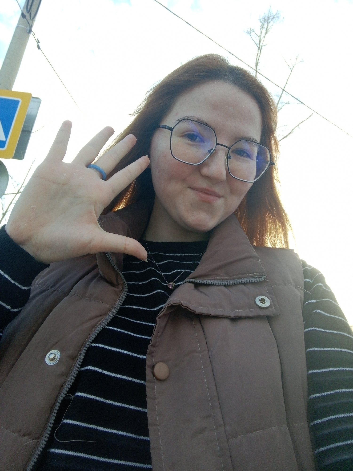 A low-angle, eye-level portrait depicts a young female with reddish-brown hair and a light complexion, wearing hexagonal-frame glasses. She smiles subtly at the camera. Her attire includes a black and white horizontally striped long-sleeved shirt, over which a taupe quilted puffer vest is worn, secured by a partially zipped closure and featuring a silver snap button on the left upper chest flap. A thin silver chain necklace with a small pink pendant is visible around her neck. Her left hand is raised towards the camera, palm open with fingers slightly splayed. A blue silicone ring is present on her left ring finger. The background is a bright, overcast sky. Elements visible on the left include a utility pole with wires, and a partial view of a blue and yellow road sign, consistent with a "priority road" sign. Bare tree branches are also discernible against the sky. The scene is outdoors in the city of Chaikovsky, Russia.