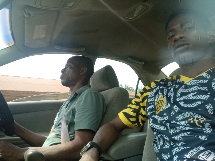 Two men are inside a car. The driver wears a green button-down shirt and a seatbelt. The passenger wears a black and yellow patterned jersey and a watch. The car's interior is light-colored, and a building is visible through the windows. The driver is focused on the road while the passenger is looking towards the camera. There is glare and a blurry area in the upper right of the image.